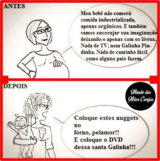 Quantas de nós, durante a gravidez de nos primeiros meses após o parto, não tivemos conversas como as da imagem de cima? Num mundo perfeito, cor-de-rosa e utópico, tudo na maternidade corre como planeámos ou idealizámos durante a gravidez. Nada nos consegue trocar as voltas, o nosso bebé dorme a noite inteira desde que sai da nossa barriga. Nada de choros, cólicas nem vê-las! E quando chegar a altura da introdução da alimentação complementar, vamos ser umas mães do que perfeitas e vamos dar sempre toda a alimentação o mais caseira possível. Nada de cerelacs e afins para os nossos filhotes. E muito menos TV e coisas desse género que são o entretenimento mais fácil a que os pais podem recorrer quando estão desesperados com a casa em estado de guerra e não conseguem fazer nada. Somos todas mães em modo Gandalf... Papas industrializadas, canais Panda, Baby First e afins, you shall not pass!!